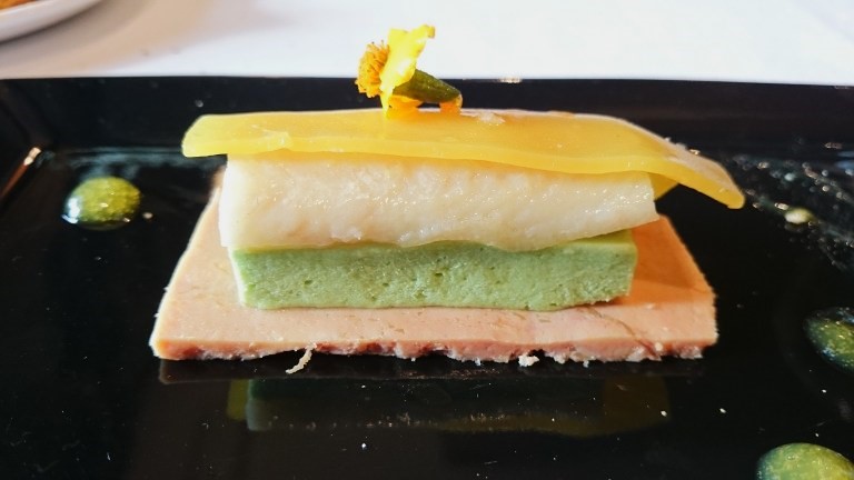 Slightly smoked eel and avocado in spiced quince veil over foie gras with citric aromatic drops.