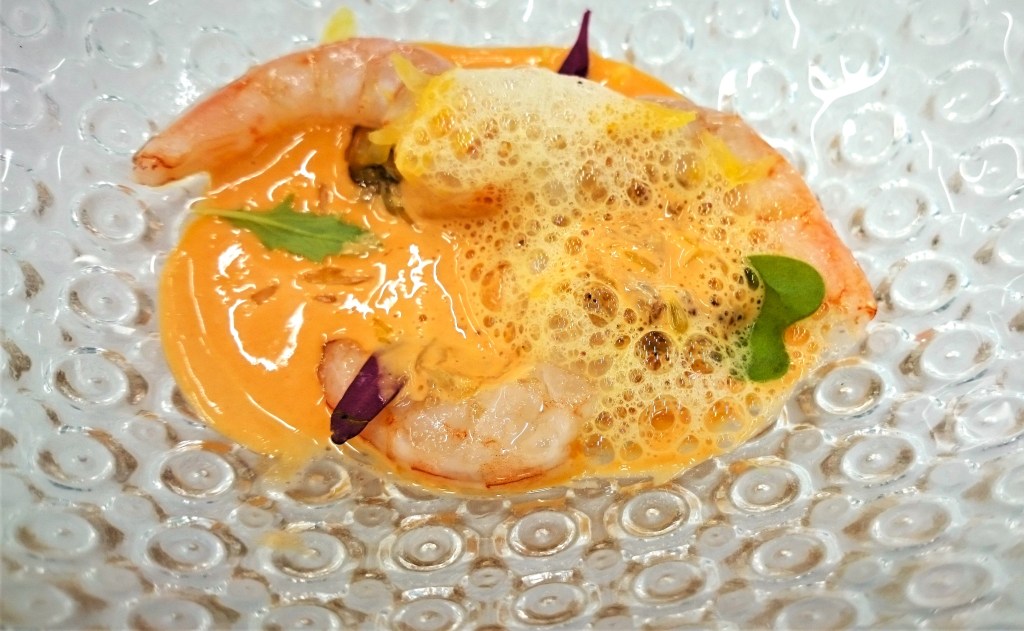 Gambas de Huelva sobre pieles de bacalao y mayonesa de sus corales.