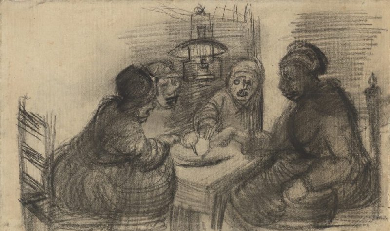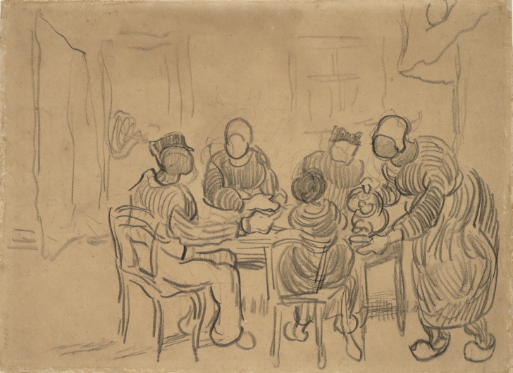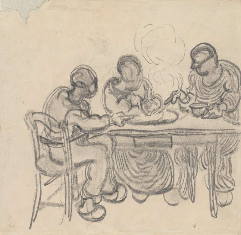 He decided to rework the potato eaters and started sketching with pencil on paper human figures around a table. The improvement in rendering the human body is visible.