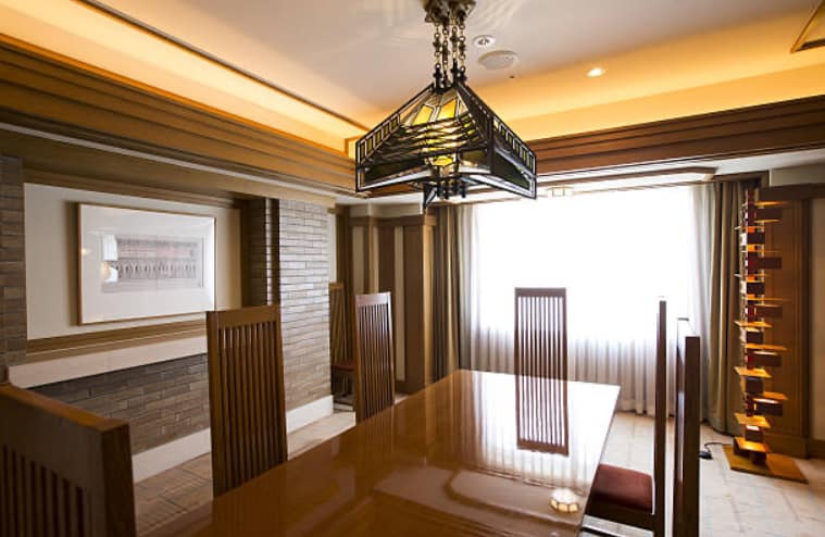 The chairs surround a table in the dining room of the Frank Lloyd Wright Suite at the Imperial Hotel in Tokyo, Japan, Friday, August 19, 2016. Photographer: Tomohiro Ohsumi/Bloomberg via Getty Images.