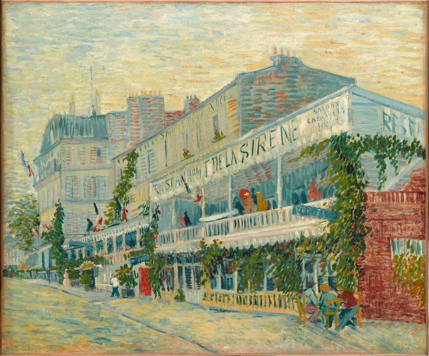 In The Restaurant de la Sirène Van Gogh increased the white brushstrokes, while still using the full richness of his palette. The painter Emile Bernard was without doubt alluding to a depiction of the restaurant de la Sirène when he recounted to Vuillard that some of the works Van Gogh produced in Paris featured “smart restaurants decorated with coloured awnings and oleanders”. Although this painting is one of his closest in style to Impressionism, Van Gogh increased the parallel hatching thus suggesting a more personal style that would soon reach its peak.‘