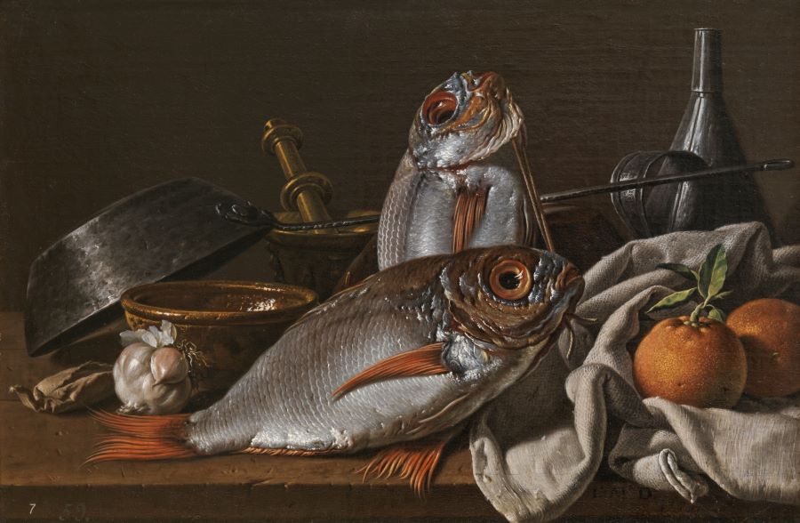 Two splendid sea breams play the leading role here. They are surrounded by lesser motifs, including oranges, a kitchen towel, a head of garlic, and packet of what is probably spice, two terracotta bowls from Alcorcón, a long-handled pan, a mortar whose pestle leans into the background, and a cruet that participates in this work’s careful study of light as a means of defining volumes, diversifying the shades of color and distinguishing the qualities of the different materials. The result is a pictorial spectacle filled with details that reflect a powerful realism imbued with the poetic nature of the everyday.