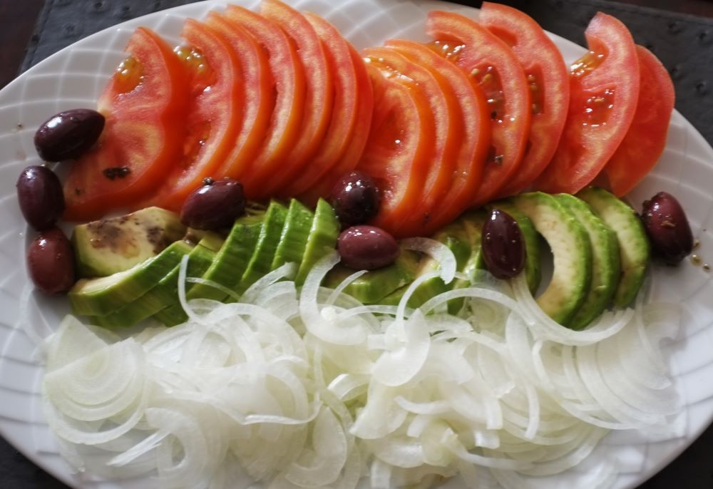 I accompany the dish with a fresh salad of tomatoes, onions, avocado and Kalamata olives.