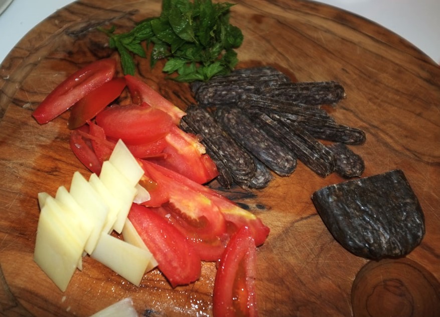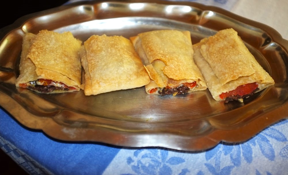 In addition to the sujuk, the filling of the borek comprises: sliced fresh tomatoes, sliced hard yellow cheese (I used Greek gruyere), and mint leaves.