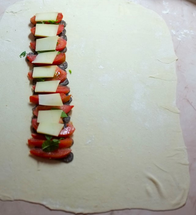 I place the sujuk on the phyllo, then the tomato slices, the mint leaves, and on top of everything the cheese.