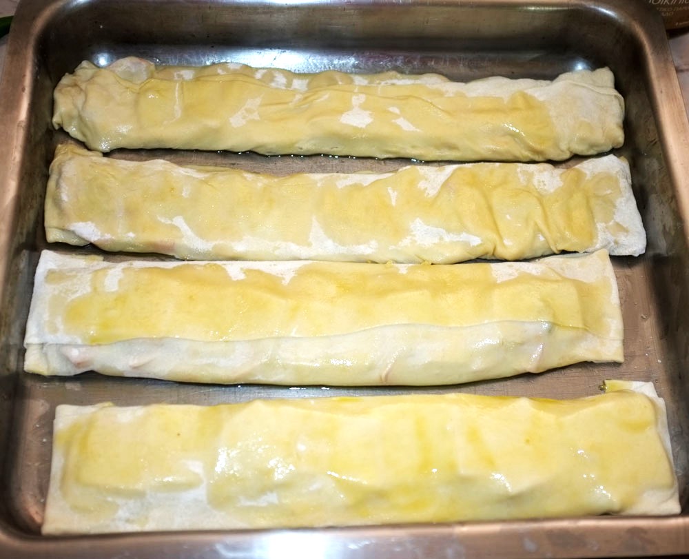 I prefer to give the borek the shape of a baguette, as it is easier to bake and serve. If you prefer you can fry it, but baking is far superior for this dish.