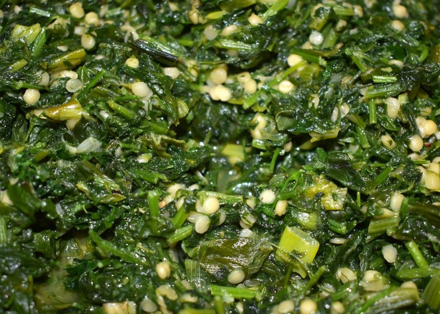 I add fennel and sorrel to the mix of aromatic greens and chop them finely. I chop some spring onions and sauté them in olive oil until they soften. I add the greens to the pan and leave them for a couple of minutes until they start exhuming their aromas. I take the pan off the heat and add one spoon of rice or tarhana to absorb the extra liquids.