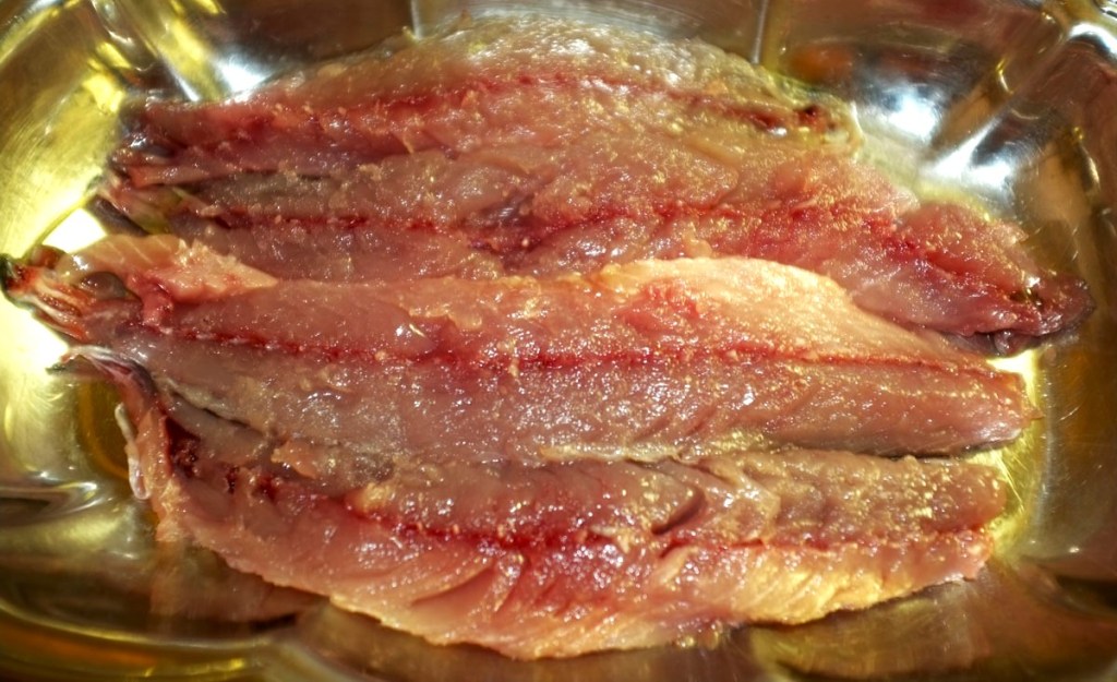 I place the filets with the skin side at the bottom of an oval serving dish and cover with olive oil. The fish is ready to serve.
