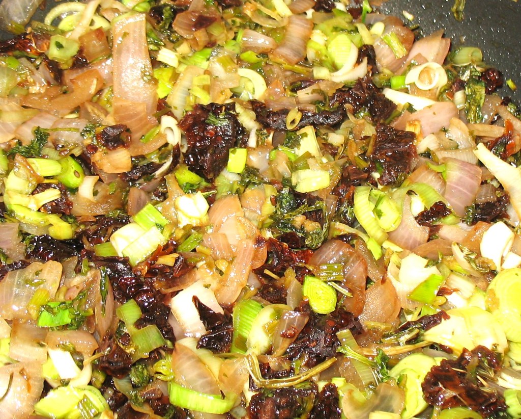I prepare a stuffing mix with dry onions, celery, garlic, sun dried tomatoes and leeks, and put them in a pan at a temperature that just removes half of their water content, evidenced by them becoming soft.