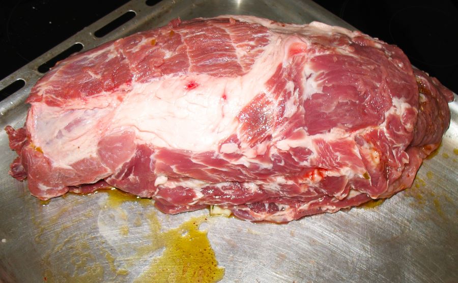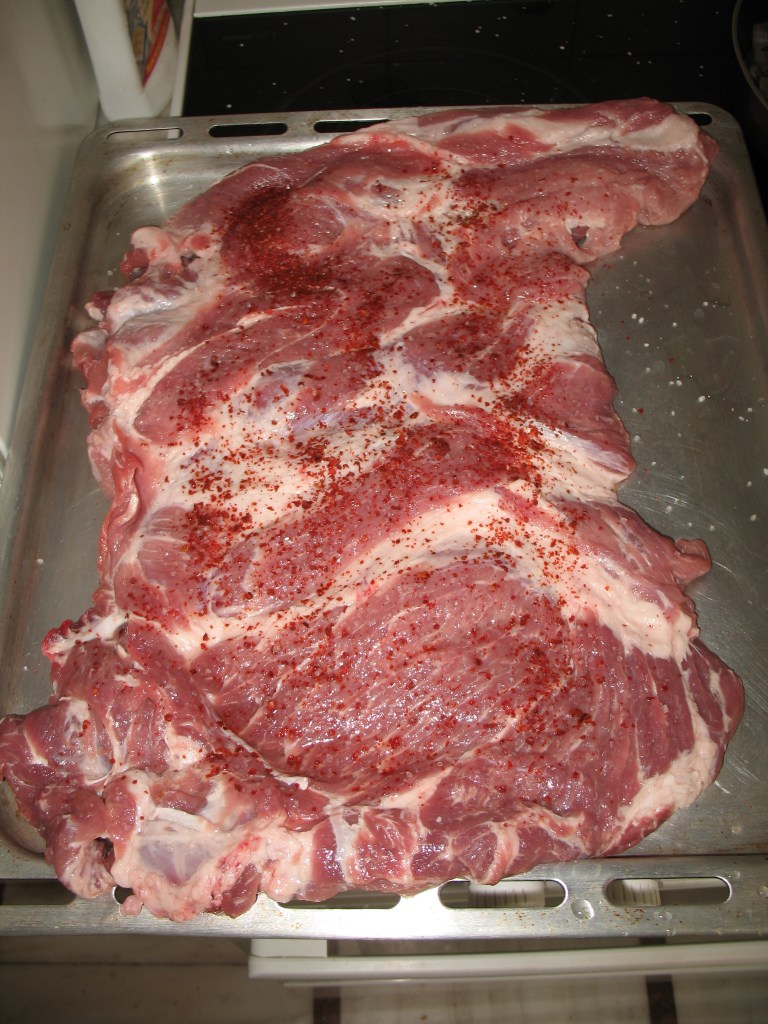 I fold the meat tightly in oven paper and bake for 3 hrs (for a piece of meat weighing 3 kg) at a temperature of 200 Centigrade.