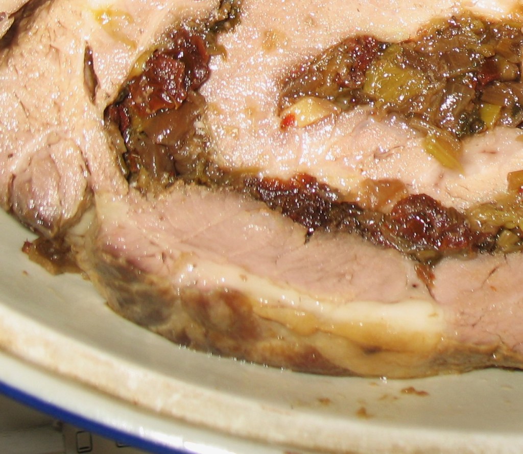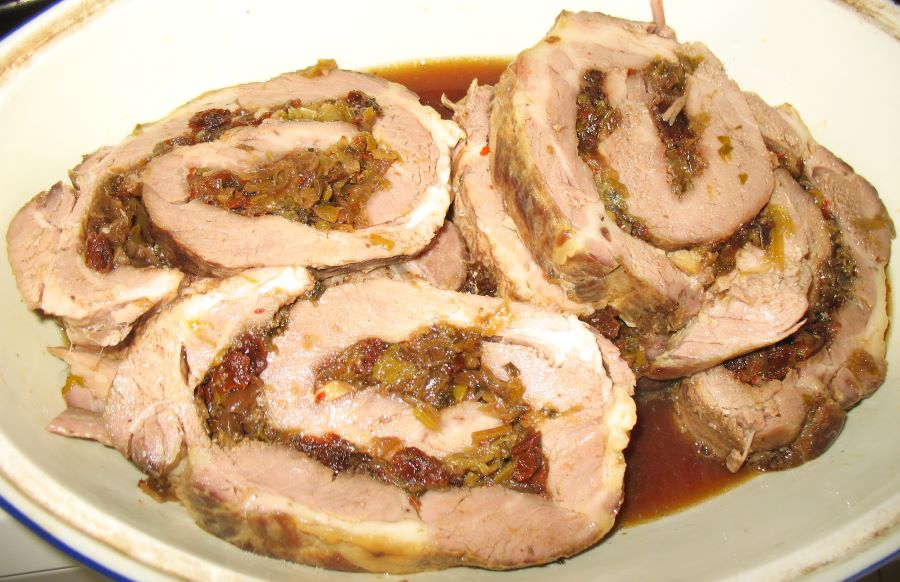I spread the filling over the meat and roll it carefully so that no filling escapes from the fold.