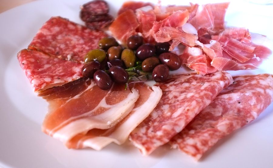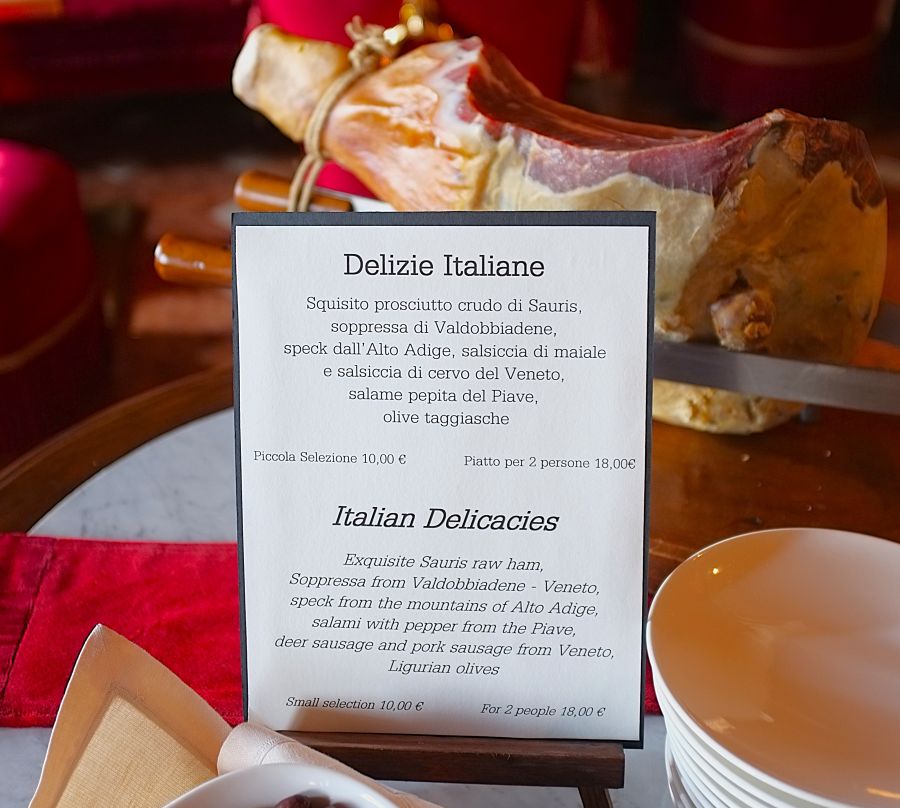 Prosciutto crudo di Sauris is the prince of this dish of mixed cured meats. Sauris is a locality near Udine, where this tender and tasty prosciutto crudo is produced. Its taste profile is more intense than the profile of prosciutto di Parma.