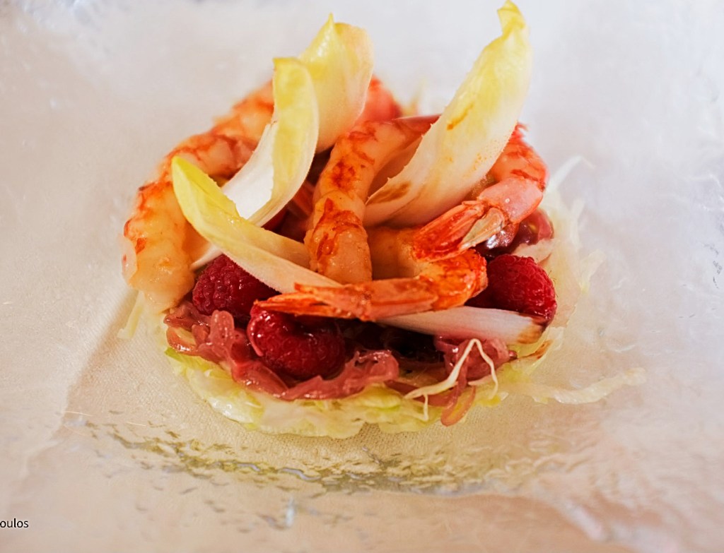 Gamberi (prawns) “in saor” (sweet and sour). A delightful appetizer. The prawns are seared for one or two seconds, literally, and then served on a bed of cabbage and pickled red onions, with raisins and raspberries (lamponi). On top the chef placed a few finocchio leaves. The red onions are pickled and caramelized, adding the mild sweet and sour background to the taste of the prawns.