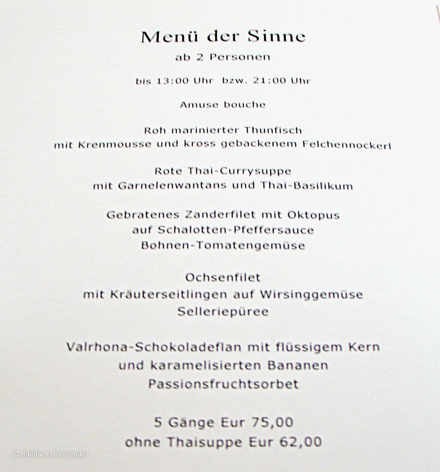 We ordered the menu of the day (Menu of the Senses) with one change. Instead of the Thai soup, we took the tripe dish, following the recommendation of the maître d’ hotel.