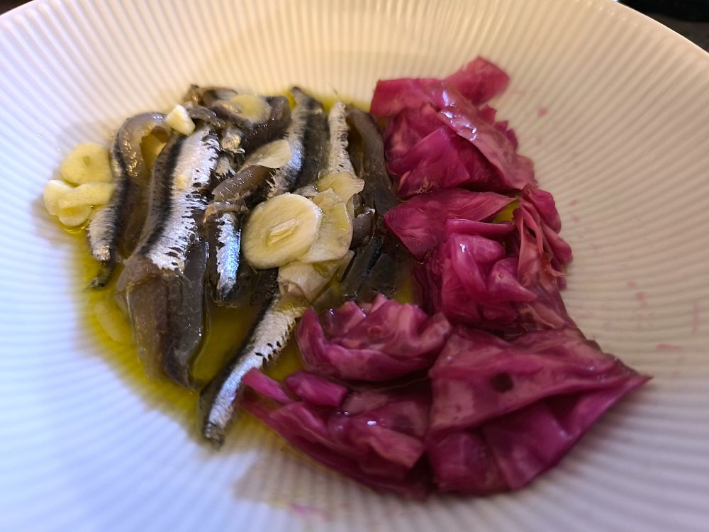 The appetizer is lightly cured anchovies served with pickled cabbage.
